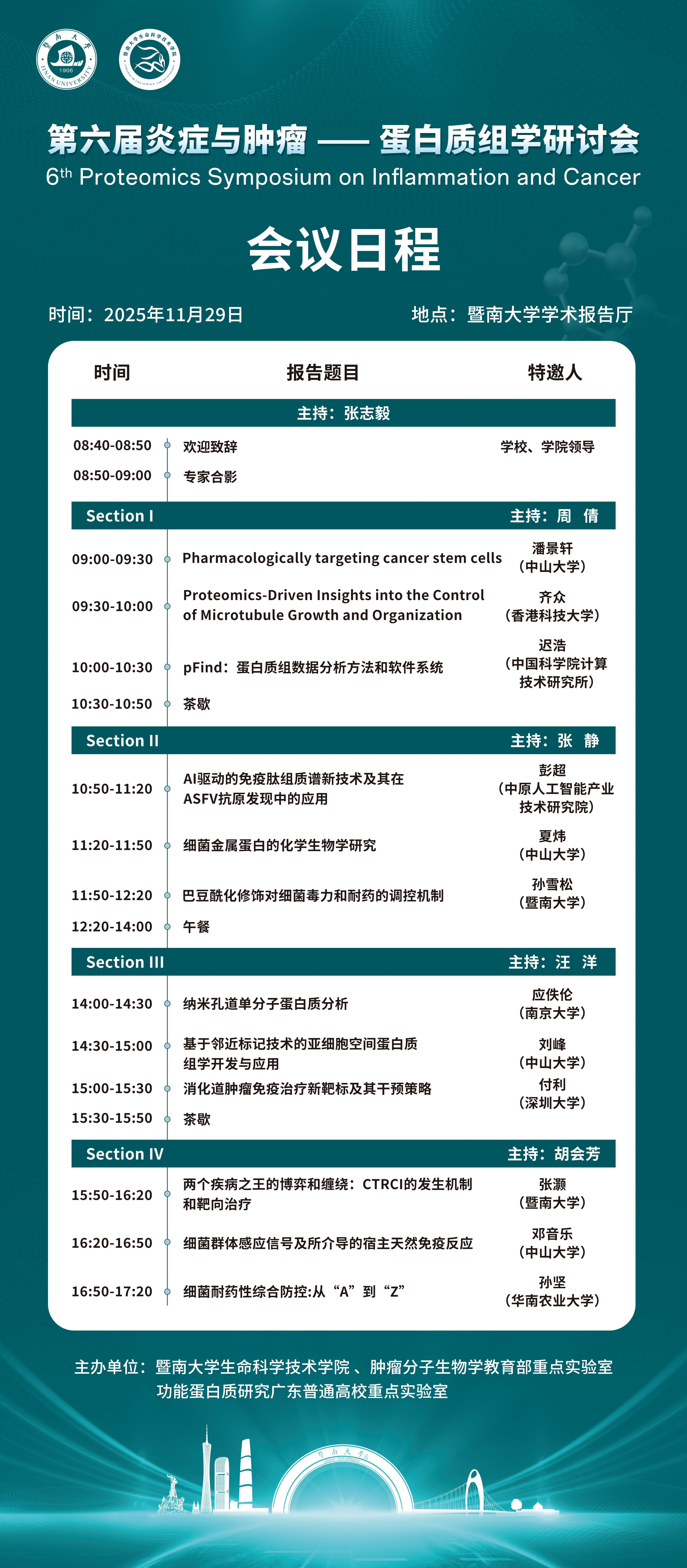 会议主题为蛋白质组学驱动的炎症与肿瘤研究。议题涵盖基于蛋白质组学技术的炎症与肿瘤的分子机制探讨、细菌致病耐药机制与防控、蛋白质研究新技术带来的多组学研究策略变革、疾病靶标发现及个体化治疗策略的创新与转化、未来研究方向与合作机遇。