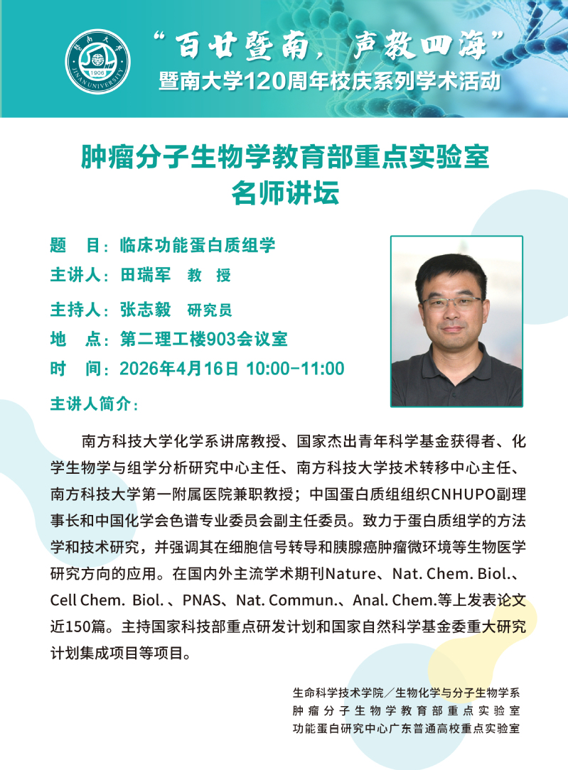 暨南大学120周年校庆系列学术活动——肿瘤分子生物学教育部重点实验室名师讲坛